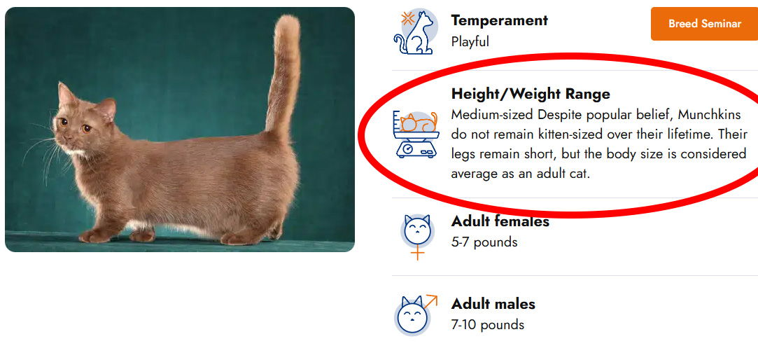 曼赤肯並非傳言所說的是小型貓,儘管人們普遍認為曼赤肯一生都保持幼貓般的體型,但事實並非如此。它們的腿雖然仍然較短,但成年後的體型屬於中等水平,而且 TICA 禁止曼赤肯縮小化變成小型貓,因此有良心的繁育者會用心的選育中大型貓種,而波斯系布偶比傳統布偶小,是屬於中型貓。
