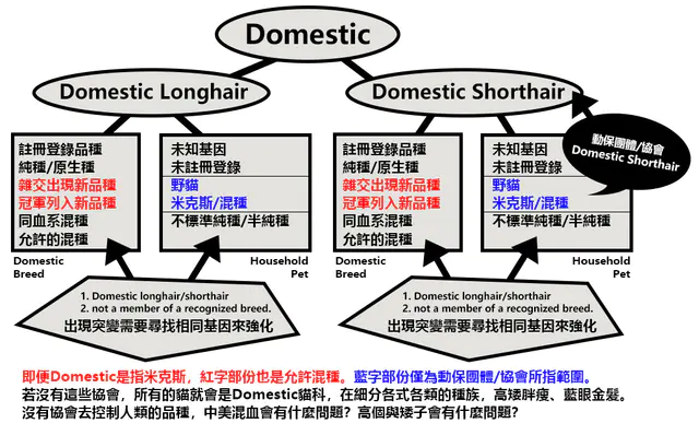 也就是說,是有兩種允許交叉混配,not a member of a recognized breed. 就是【未認證的品種】也就是米克斯,而第一個 Domestic 是學名【家貓】,家貓指的是【所有的貓】,限定短毛/長毛不用加逗號,意思是無毛不行,這就是逗號在防止歧義的重要性。