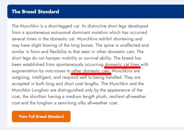 augmentation by outcrosses to other domestic cats還要特別找短腿的米克斯來加強短腿基因?不是【外觀被認可的品種 — 矮小化】而是【外觀被認可的品種 — 縮小化】