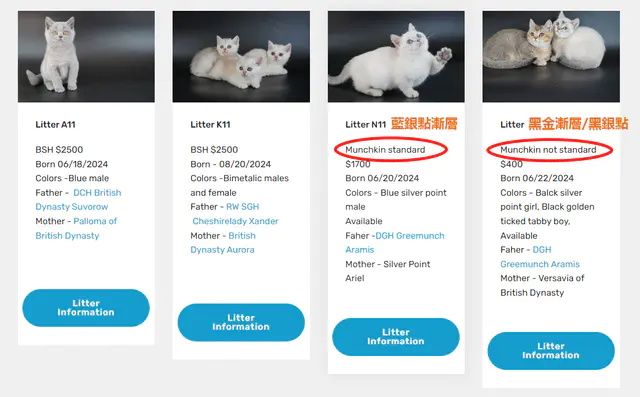 在來看看其它貓舍的特徵,明顯都是品種貓的外觀及顏色。(這裡更新: 綠單通常不會公佈,所以查證困難。)