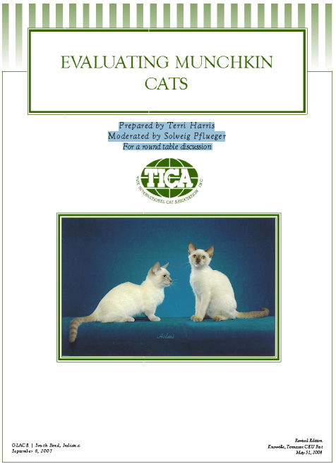 規範裡面會被取消資格的,通常都是有明顯的缺陷,所以會被取消資格,像是Sway back(搖擺背). Excessive bowing(過度鞠躬). miniaturized(縮小化),我在TICA的其它文件不管是培育規則及介紹都是使用short legs(短腿化),因此 miniaturized(縮小化)指的是整體變迷你,例如茶杯犬故意追求小而迷你,而不是指腿,正式文件不會這樣模擬概括,否則【短尾】也包含在內。曼赤肯也有非標準長腿,它寫縮小就真的是縮小的意思,曼赤肯短腿也只是腿短,體型並沒有改變,是引入其它品種的時候故意追求非常小型的貓。也因為曼赤肯可以配所有品種,才會提到 Appearance of being a recognized breed。