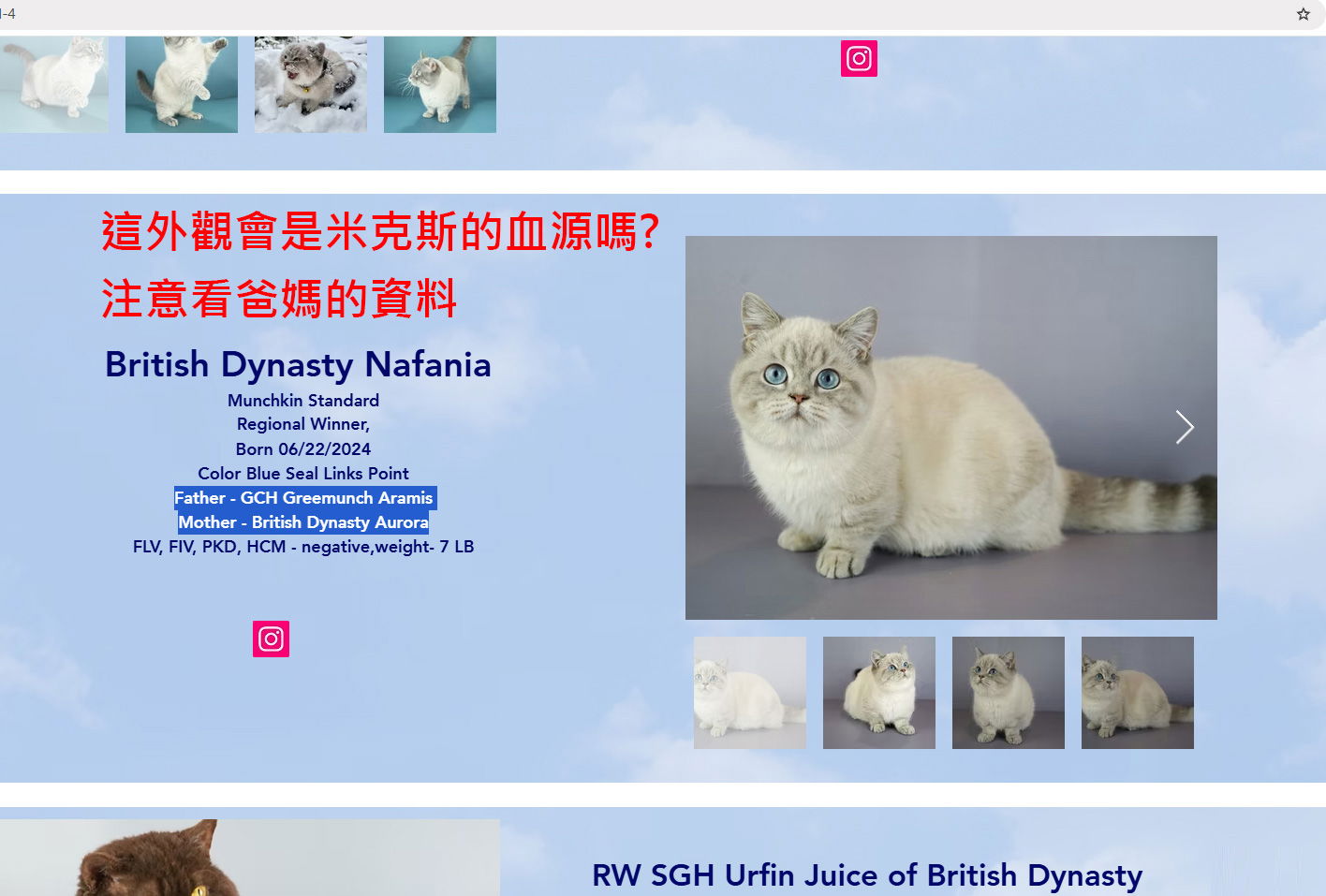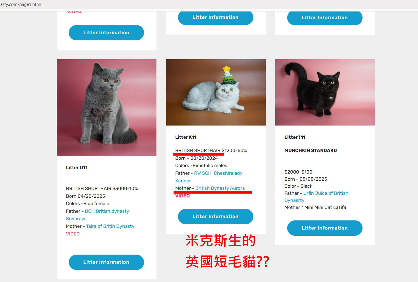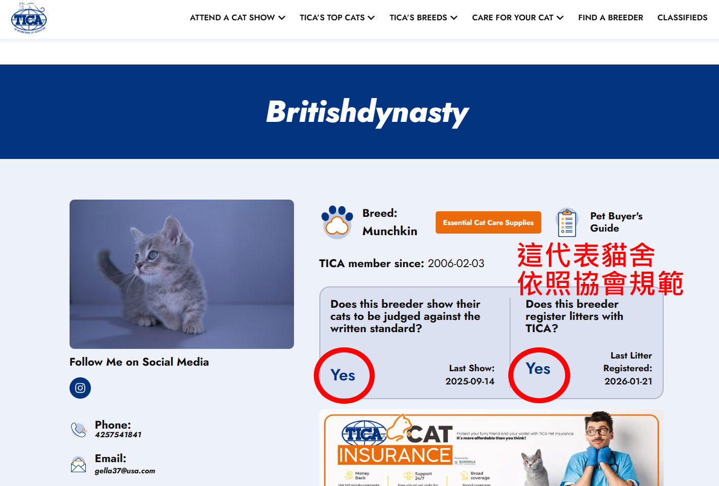 可以點進去britishdynasty貓舍的網站,該貓舍大部份是英短。留言有人提供貓舍可自行在TICA付費刊登,但這不足以推翻家貓是指所有品種(包括米克斯)。