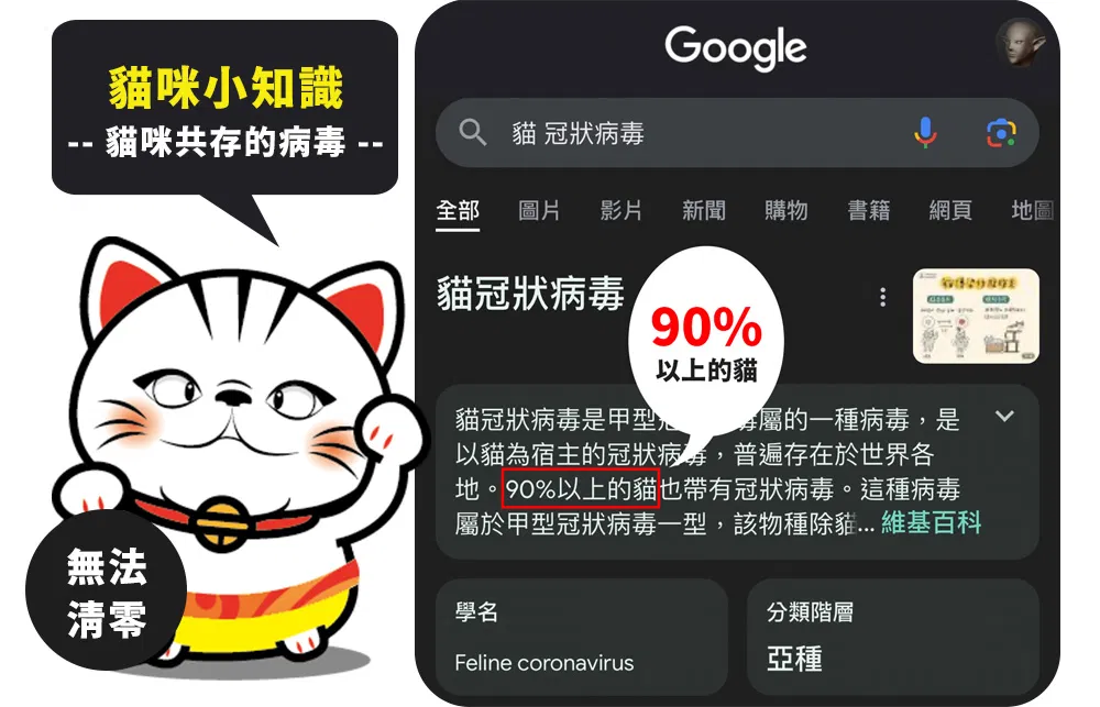 - 貓冠狀病毒:具高度傳染性,無法清零,感染後僅有輕微腹瀉或無症狀。