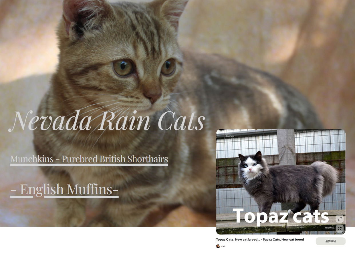 我們飼養的這種精緻的貓咪品種叫做英式鬆餅貓。這款美麗又可愛的貓咪是由五種不同的純種貓精心挑選雜交而成,它們分別是英國短毛貓、曼赤肯貓、孟加拉豹貓、布偶貓和顯性藍眼/Topaz貓。